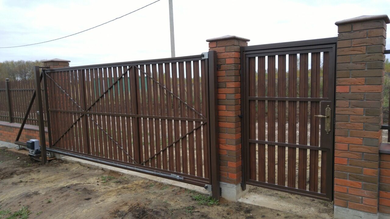 Откатные ворота из евроштакетника с встроенной калиткой
